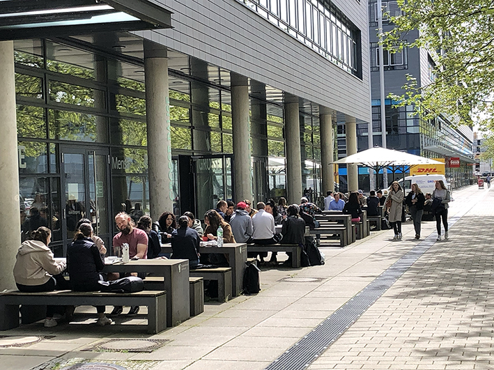 20 Grad, Sonne satt – die Freiluft-Saison auf der Expo Plaza ist eingeläutet. Die fest installierten Außenbänke vor der Kantine „Große Pause“ waren heiß begehrt. und ebenso umlagert wie die Stühle und Tische vom Café „Emma“. Wer konnte, genoss jede Minute im Freien. Doch nicht nur die Menschen „blühten“ förmlich auf, auch die Natur hat auf Frühlingsmodus umgeschaltet. Die Bäume verkünden mit zartem Grün den finalen Jahreszeitenwechsel – endlich!